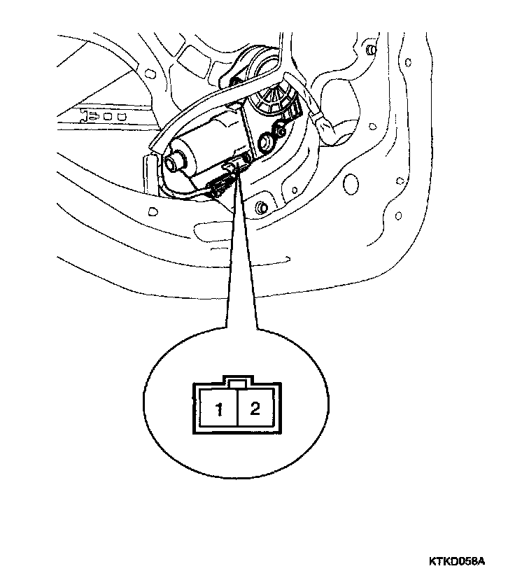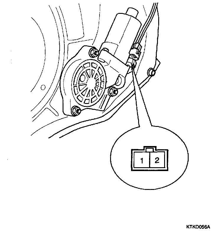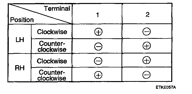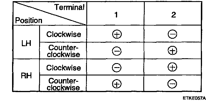 3. Connect the motor terminals directly to battery voltage (12 V) and check that the motor operates smoothly. Next, reverse the polarity and check that the motor operates smoothly in the reverse direction. If the operation is abnormal, replace the motor.