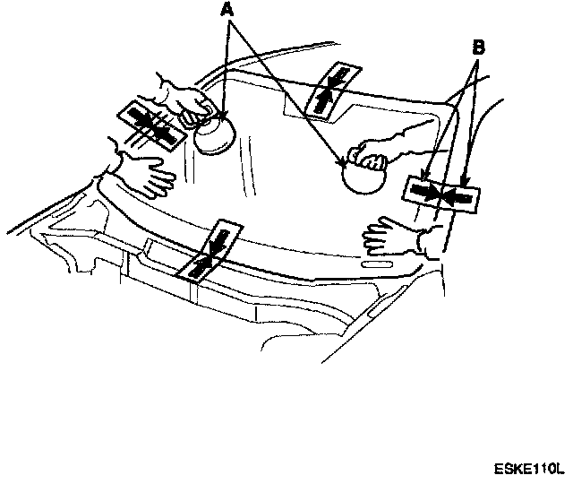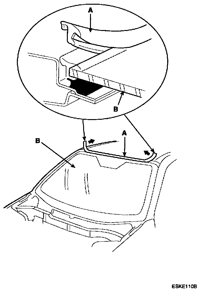2. Remove the molding (A) from the edge of the windshield (B). If necessary, cut the molding with a utility knife.