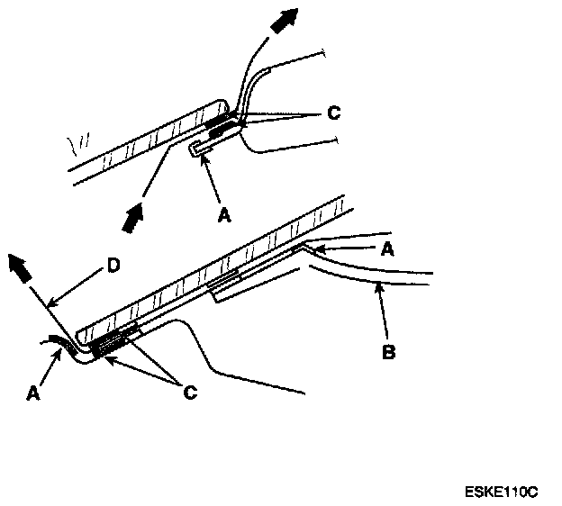 4. Apply protective tape (A) along the edge of the crash pad (B) and body as shown. Using an awl, make a hole through the sealant (C) from inside the vehicle. Push a piece of piano wire (D) through the hole, and wrap each end around a piece of wood.