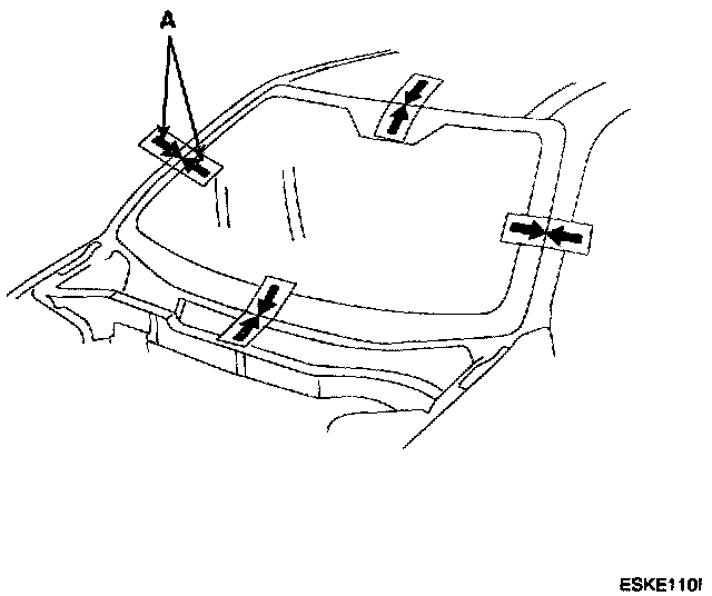 6. Set the windshield in the opening, and center it. Make alignment marks (A) across the windshield and body with a grease pencil at the four points shown. Be careful not to touch the windshield where adhesive will be applied.
