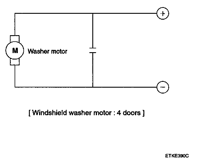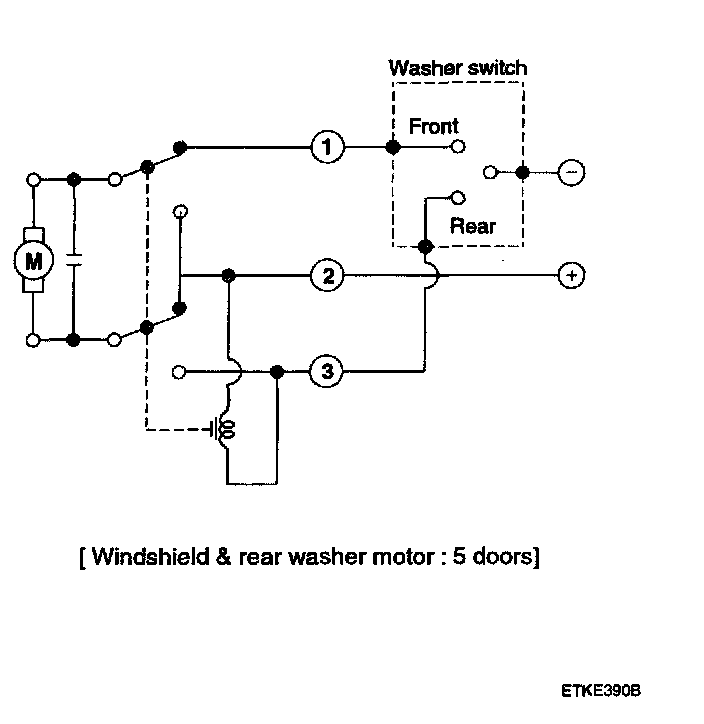 2. Connect positive (+) and negative (-) battery cables to terminals 1 and 2 respectively to see that the washer motor runs and water sprays from the front nozzles.