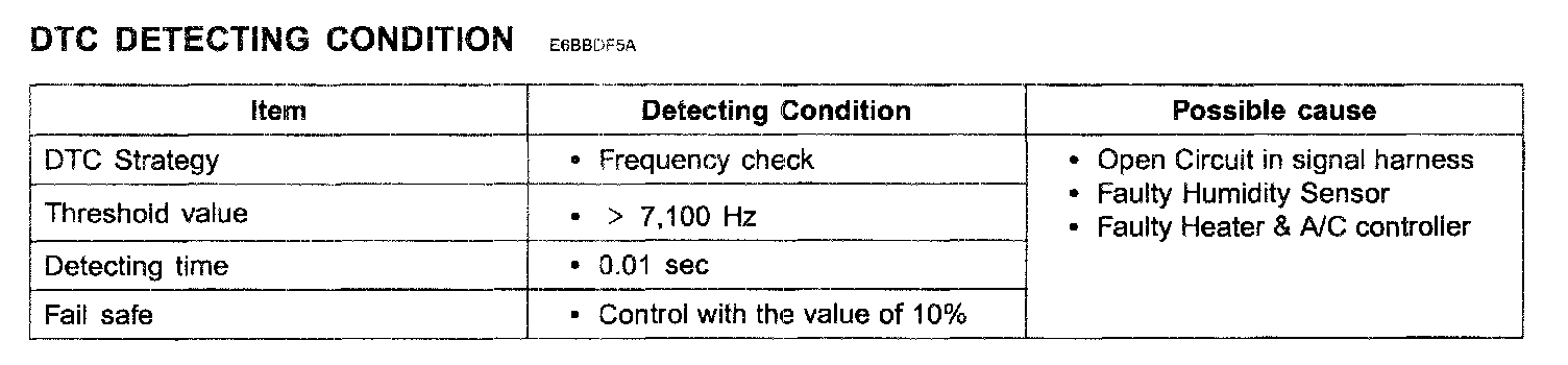 The Heater & A/C controller sets DTC B1200 if here is an open circuit in humidity sensor signal harness or the measured frequency value of sensor is more than threshold value(about 7,100 Hz)