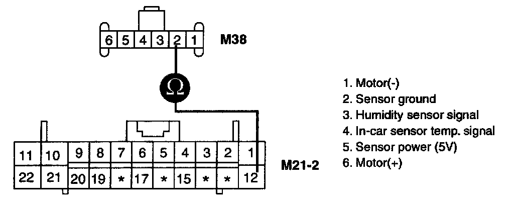 3. Measure resistance between terminal "2" of Humidity Sensor and terminal "12" of Heater & A/C controller.