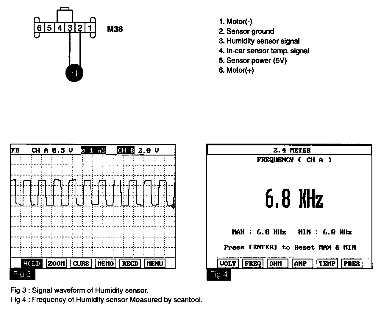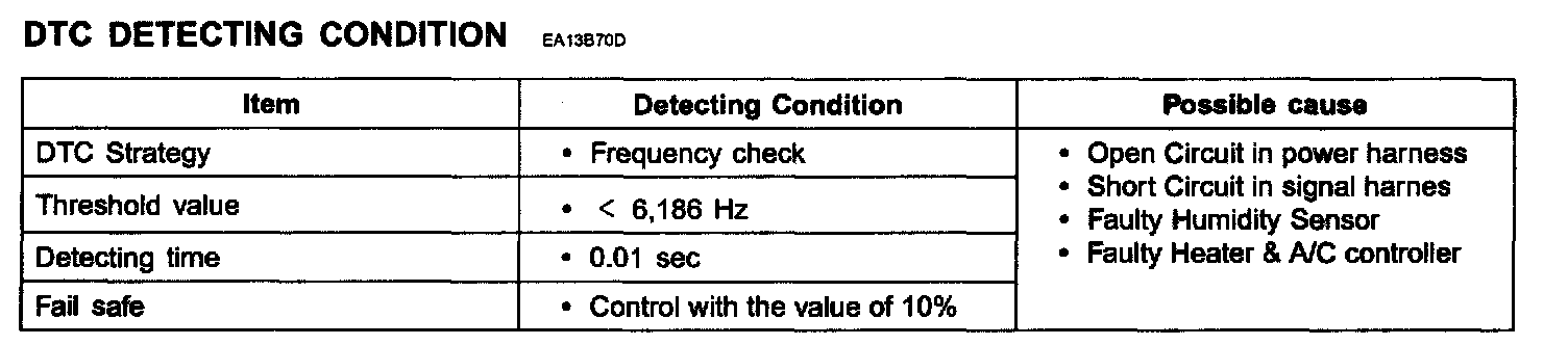 The Heater & A/C controller sets DTC B1201 if there is a short circuit in humidity sensor signal harness or the measured frequency value of sensor is less than threshold value(about 6,186 Hz)