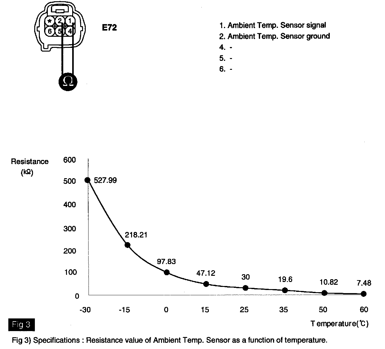 3. Measure resistance between terminal "1" and "2" of Ambient Temp. Sensor.