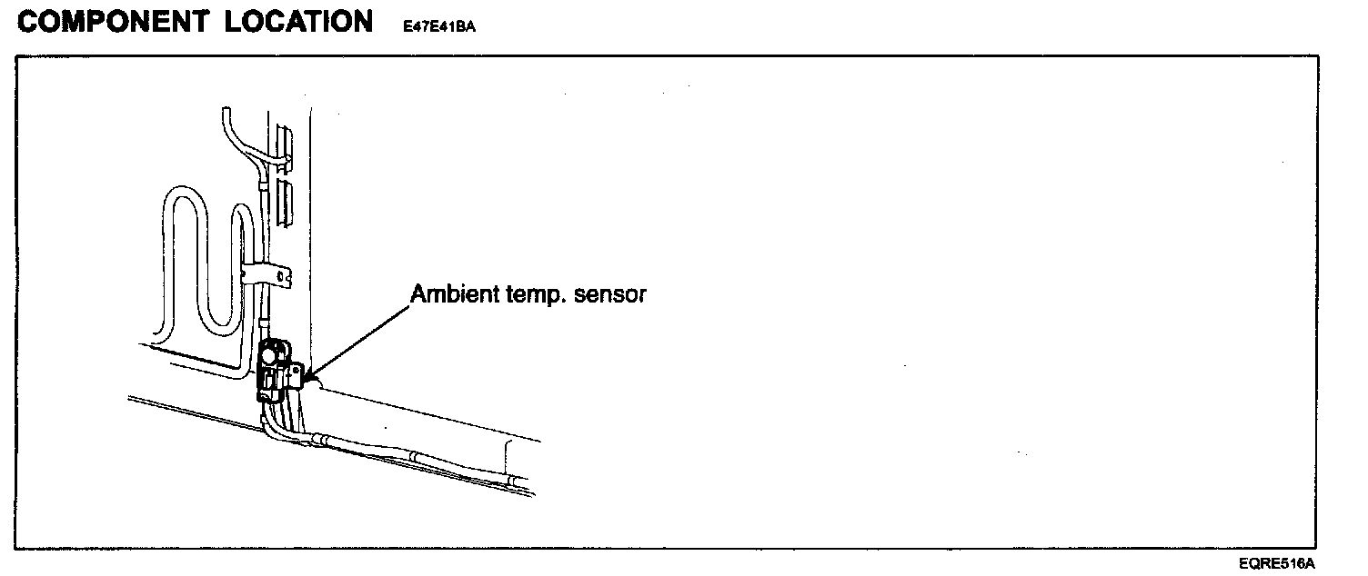 The Ambient Temperature Senor located at the center stay of the condenser, detects ambient air temperature. It is a negative type thermistor whose resistance is inversely proportional to temperature. Its output is used for discharge temperature sensor, sensor fail-safe, temperature regulation door lock, blower motor level control, mix mode control and in-car humidity control.