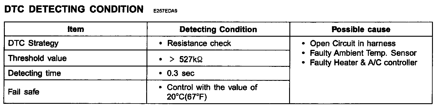 The Heater & A/C controller sets DTC B1238 if there is an open circuit in Ambient Temp. Sensor signal harness or the measured resistance value of sensor is more than threshold value(about 527 Kohms)