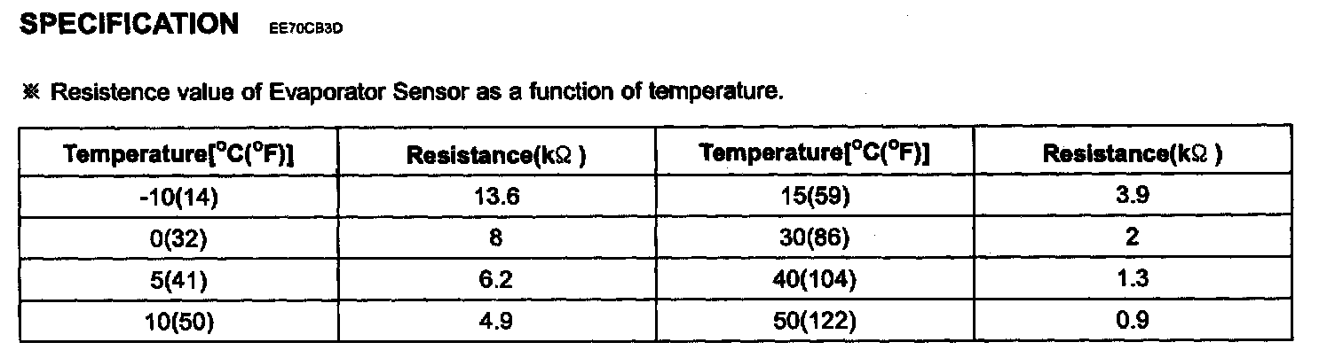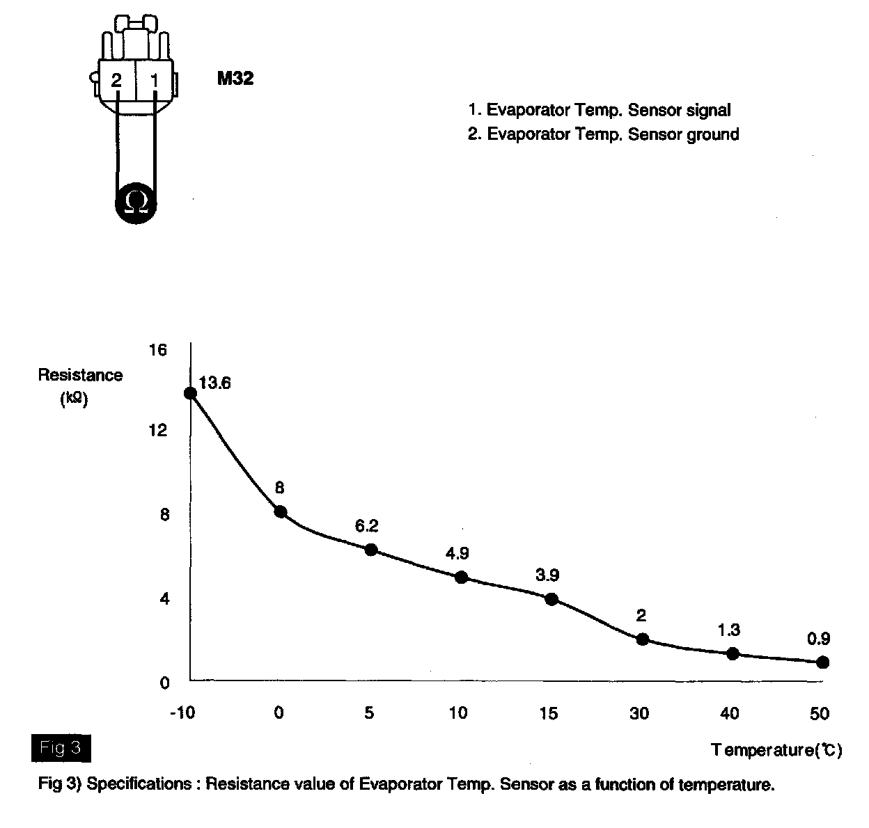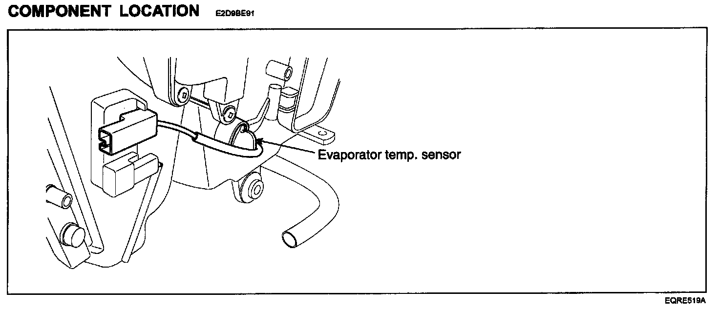 The Evaporator Temperature Sensor located on heater unit, detects the core temperature and interrupts compressor relay power, in order to prevent evaporator freezing by excessive cooling. It is a negative type thermistor whose resistance is inversely proportional to temperature.