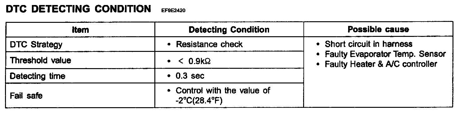 The Heater & A/C controller sets DTC B1241 if there is a short circuit in Evaporator Temp. Sensor signal harness or the measured resistance value of sensor is less than threshold value(about 0.9 KOhm)