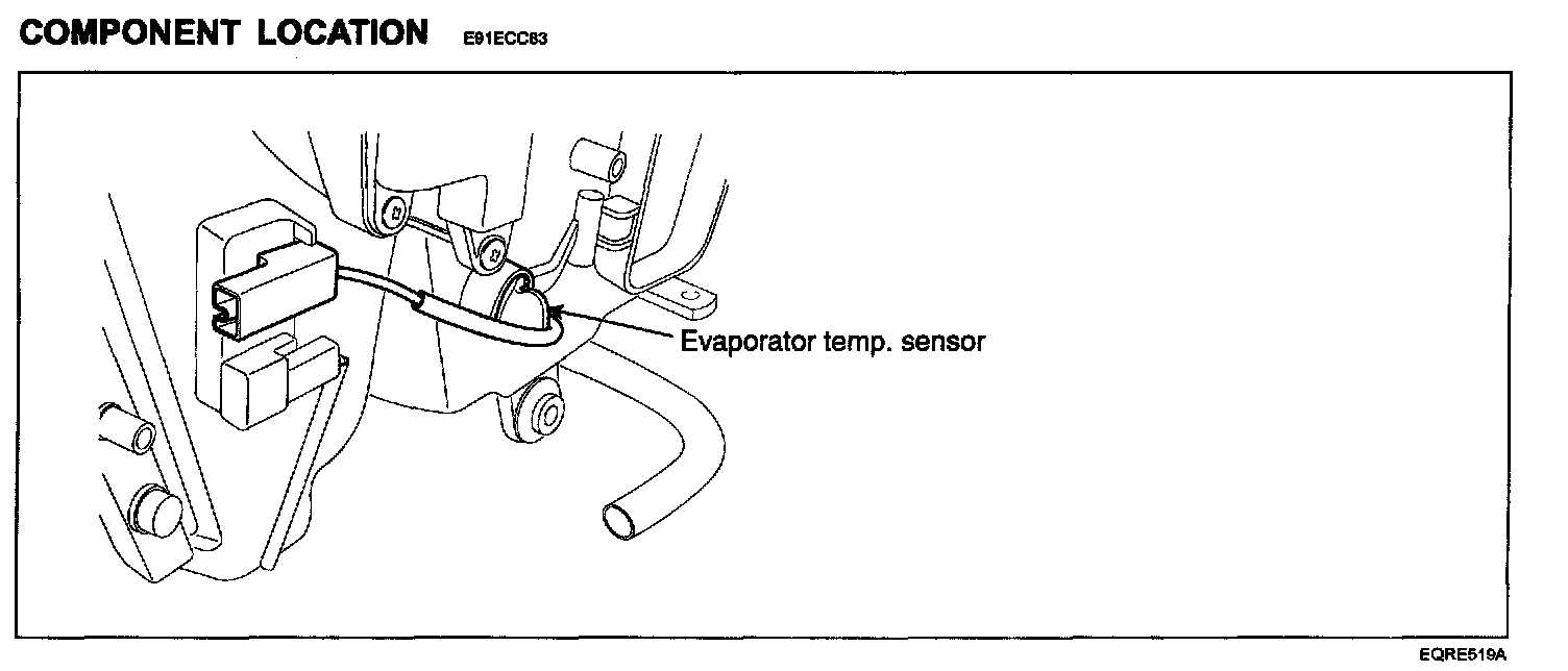The Evaporator Temperature Sensor located on heater unit, detects the core temperature and interrupts compressor relay power, in order to prevent evaporator freezing by excessive cooling. It is a negative type thermistor whose resistance is inversely proportional to temperature.