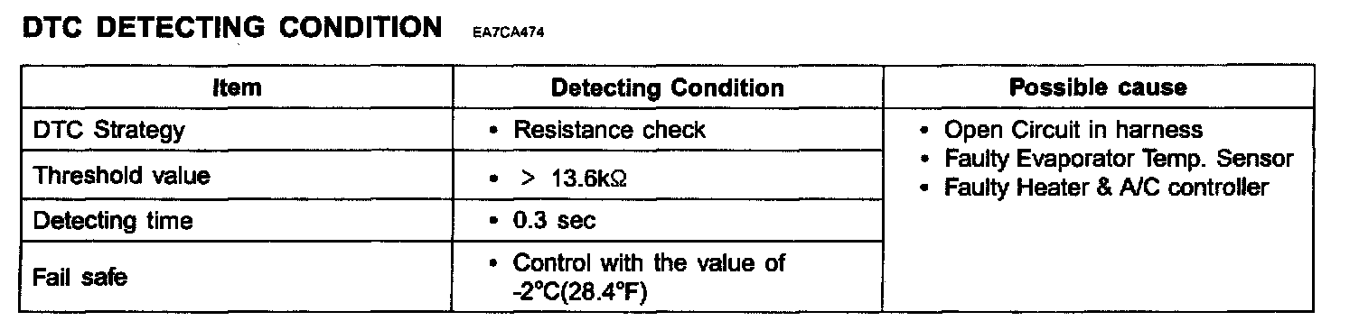 The Heater & A/C controller sets DTC B1242 if there is an open circuit in Evaporator Temp. Sensor signal harness or the measured resistance value of sensor is more than threshold value(about 13.6 Kohms)