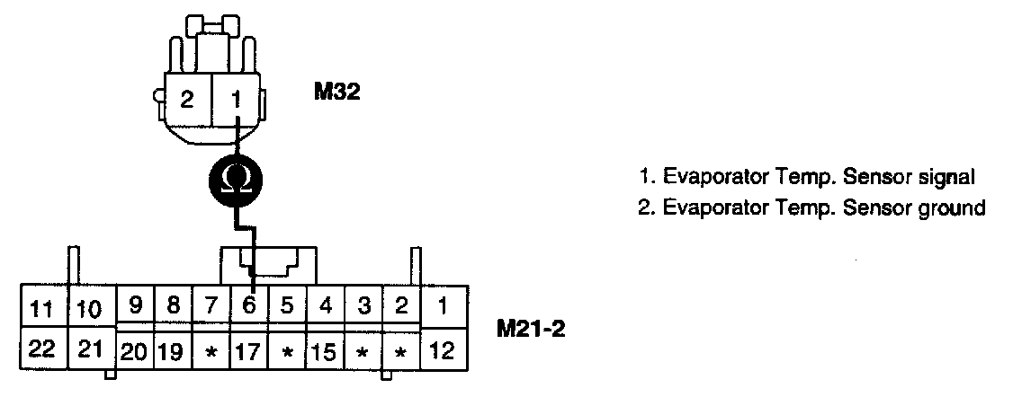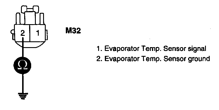 3. Measure resistance between terminal "2" of Evaporator Temp. Sensor and chassis ground.
