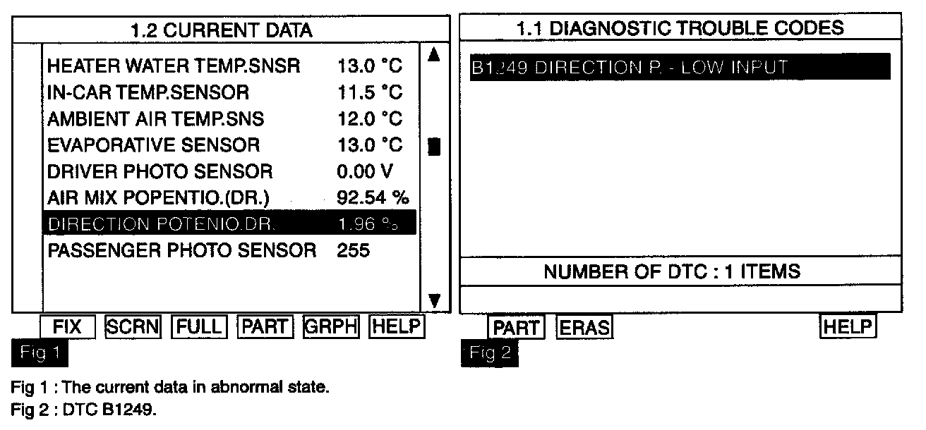 The Heater & A/C controller sets DTC B1249 if there is an open circuit or poor connection in the Direction Potentiometer.