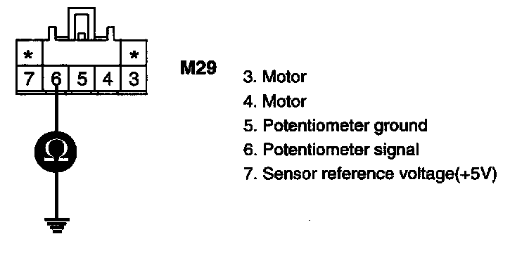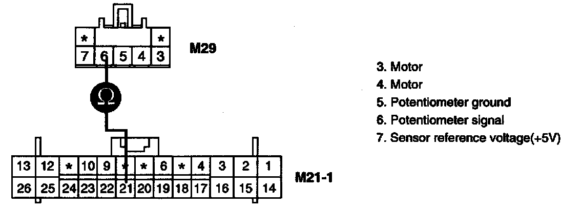 3. Measure resistance between terminal "6" of Driver Direction Potentiometer and terminal "21" of Heater & A/C controller.