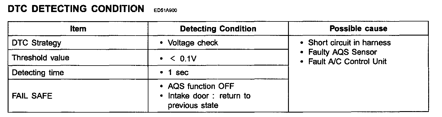 The A/C controller sets DTC B1258 if there is a short circuit in AQS sensor signal harness or the measured voltage value of the sensor is less than the threshold value.