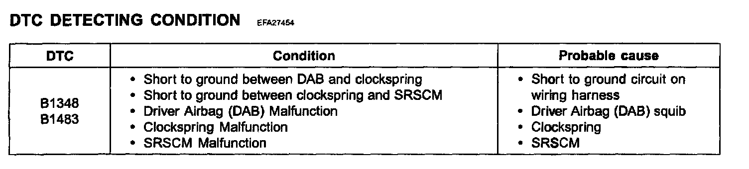 The Driver Airbag circuit consists of the SRSCM, Clockspring and the Driver Airbag (DAB) which has two squib circuits. The SRSCM sets above DTC(s) if it detects short to ground on the DAB circuit.