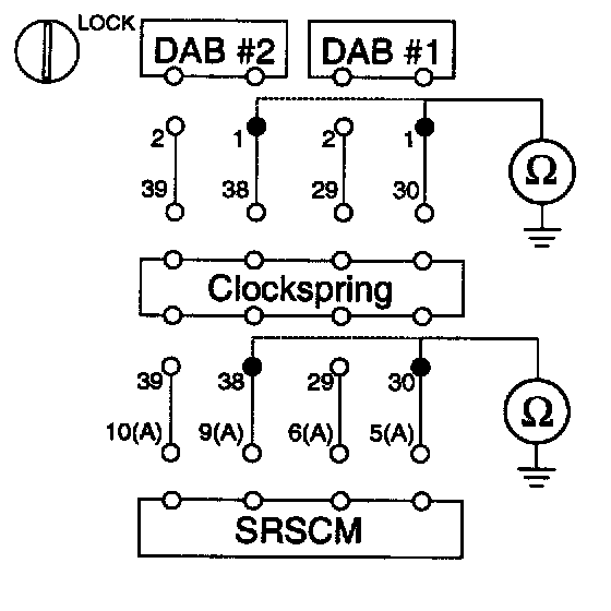 NO: Repair or replace the wiring harness between the DAB and the clockspring or between the clockspring and the SRSCM.