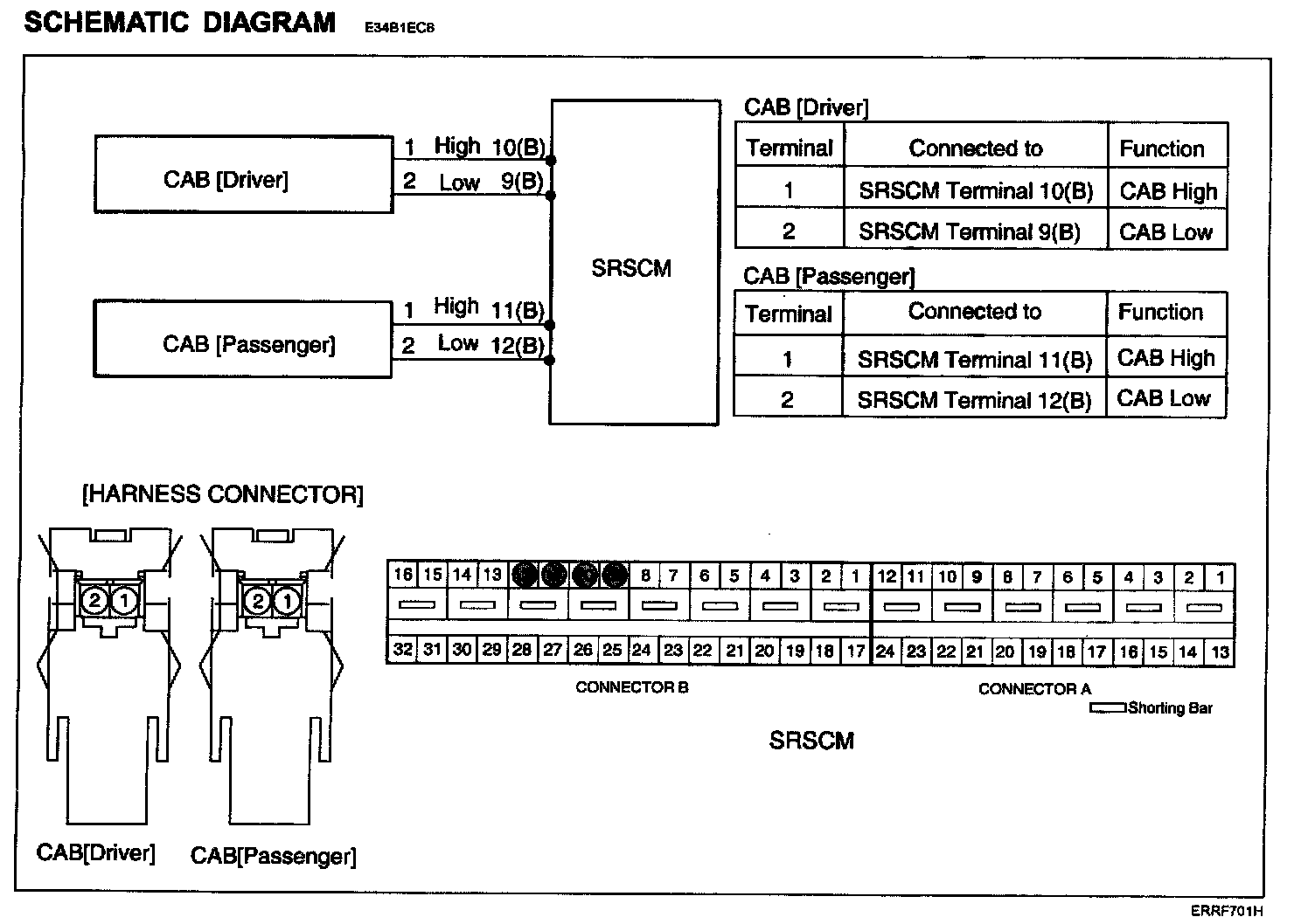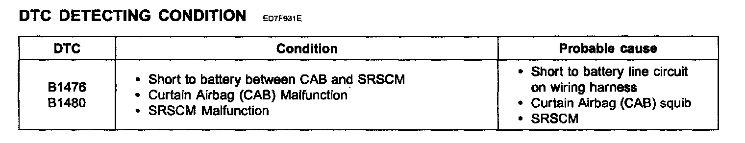 The CAB squib circuit consists of the SRSCM and CAB. It causes the SRS to deploy when the SRS deployment conditions are satisfied The above DTC is recorded when short to battery is detected in the CAB squib circuit.