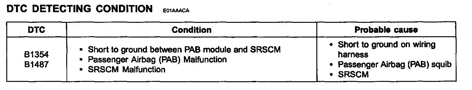 The Passenger Airbag circuit consists of the SRSCM and the Passenger Airbag (PAB) which has two squib circuits. The SRSCM sets above DTC(s) if it detects short to ground on the PAB circuit.