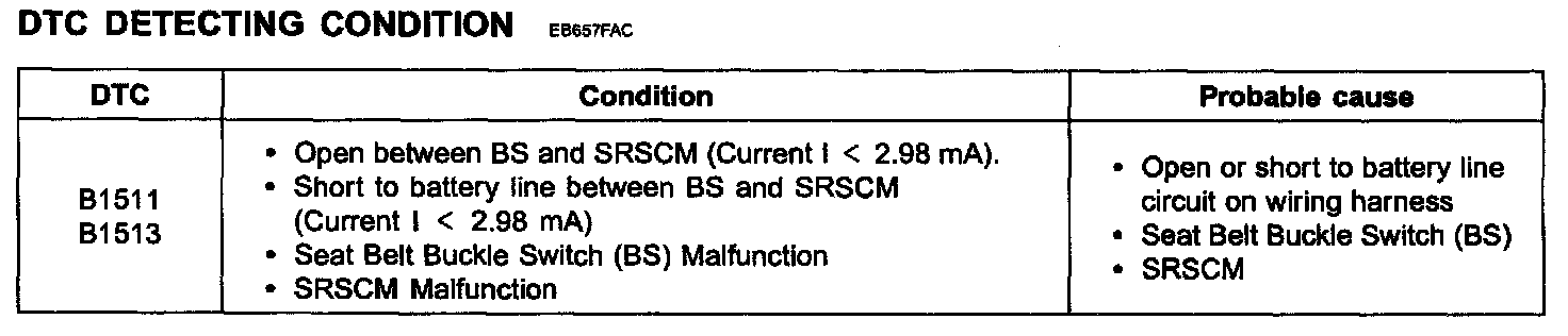 DTC B1511 SEAT BELT BUCKLE SWITCH [DRIVER] OPEN OR SHORT TO BATTERY LINEDTC B1513 SEAT BELT BUCKLE SWITCH [PASSENGER] OPEN OR SHORT TO BATTERY LINE