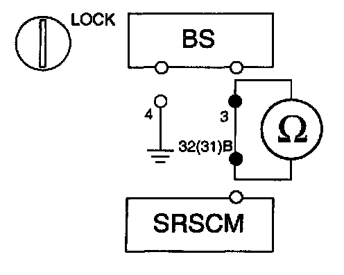 2. Measure resistance between the terminal 3 of BS harness connector and the terminal 32(31) of SRSCM harness connector (B).
