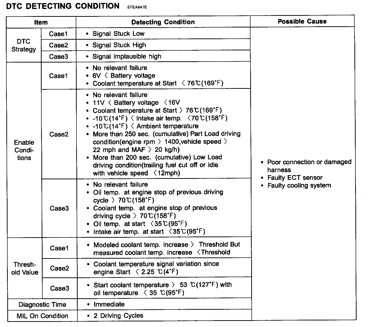 ECM sets DTC P0116 if the ECM detects stuck low, high or implausible high ECT signal