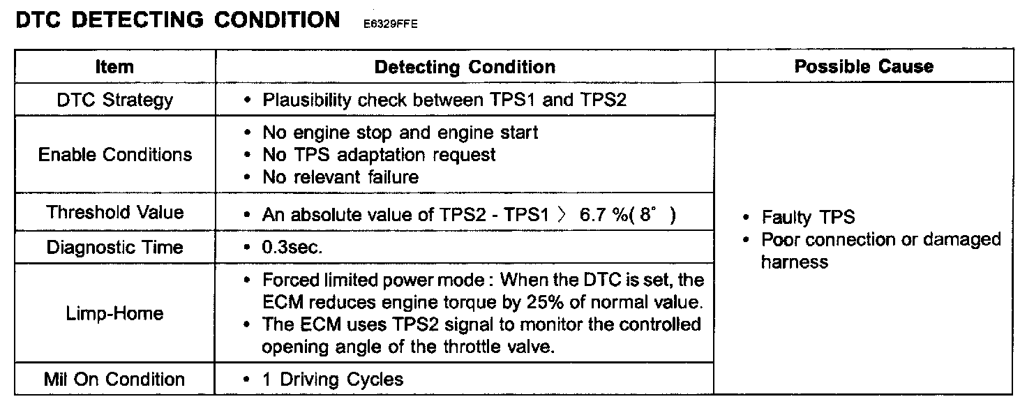 The Electronic Throttle Control (ETC) system is made of the components throttle body, Throttle Position Sensor (TPS) 1 & 2 and Accelerator Position Sensor (APS) 1 & 2. TPS1 & 2 are sharing the same source voltage and ground. The throttle valve opening is control by throttle motor which is controlled by Engine Control Module(ECM). The opposite position indicator shows inverted signal characteristics. TPS1 output voltage increases smoothly in proportion with the throttle valve opening angle after starting. TPS2 output voltage decreases in inverse proportion with the throttle valve opening angle after starting. TPS provides feedback to the ECM to control the throttle motor in order to control the throttle valve opening angle properly in response to the driving condition.