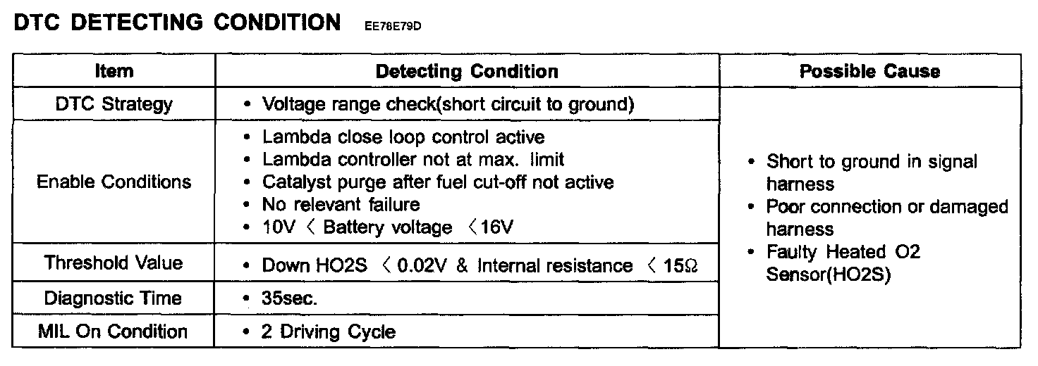 ECM sets DTC P0137 if the HO2S(B1S2. voltage remains excessively low for a predetermined time
