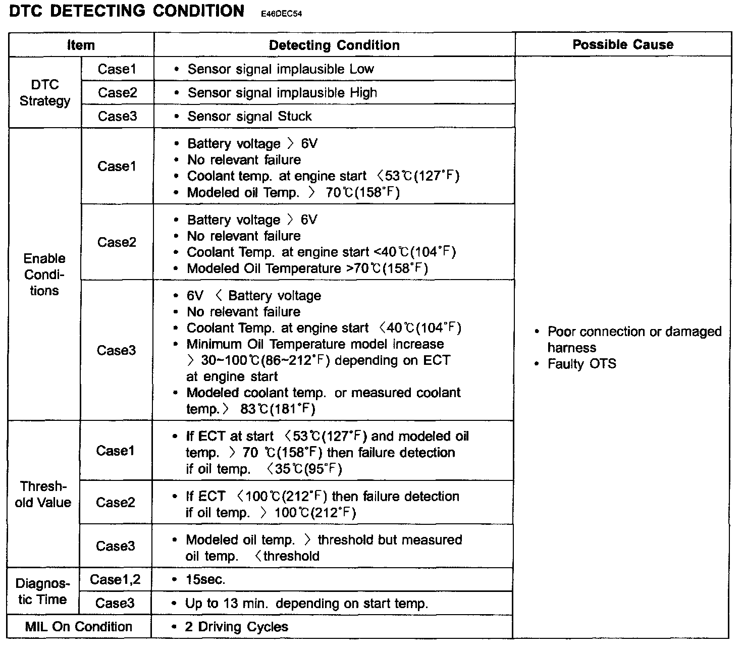 The purpose of this diagnosis is to detect a stuck oil temperature signal or implausibly low,high signal. For the stuck signal detection, the ECM checks whether after a variation of the calculated oil temperature also a variation of the measured oil temperature is detected and sets DTC P0196 if the variation of the measured oil temperature is lower than the threshold. For the implausibly high, low signal detection, the ECM compares measured engine oil temperature with calculated oil temperature or coolant temperature and sets DTC P0196 when one of following conditions is met.
