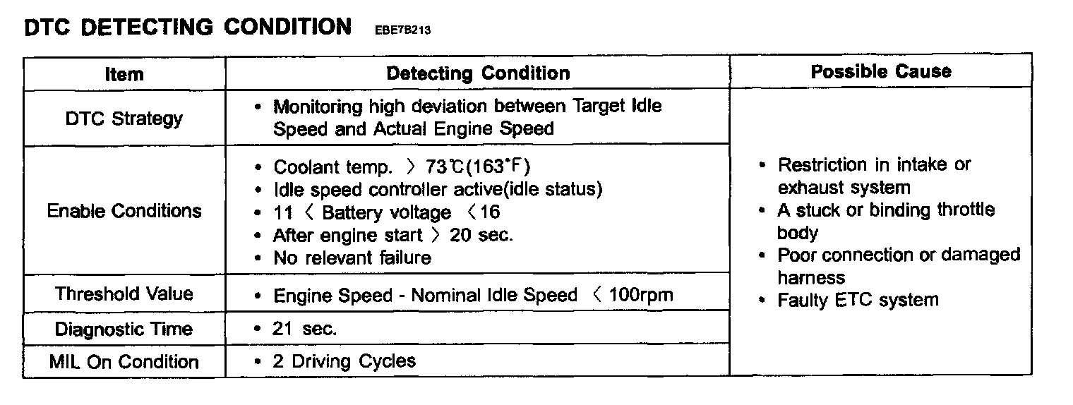 The ECM monitors engine speed deviation from the target idle engine speed when the vehicle is stopped and the throttle valve opening is stable. The ECM sets DTC P0506 if the difference to the target idle engine speed is lower than the predetermined threshold.