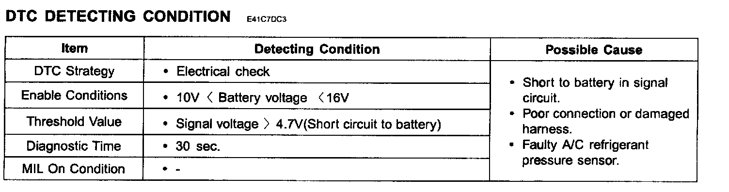 ECM sets DTC P0533 if the ECM detects signal voltage higher than the possible range of a properly operating A/C refrigerant pressure sensor.