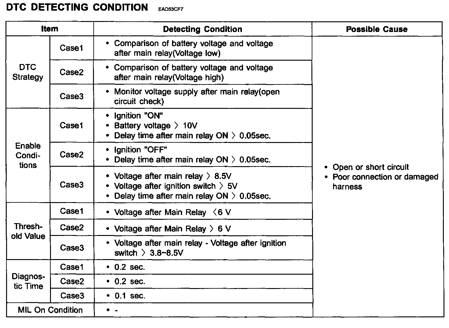 The ECM measures the voltage from ignition key and from main relay respectively and compares two voltages. This comparison will watch if the Main Relay has switched and remains on after ignition Key-On and if it has switched off after the ignition Key-Off. The ECM sets DTC P0560 if the voltage after Main Relay is lower than a predetermined threshold after ignition key-on or higher than a predetermined threshold after ignition key-off.
