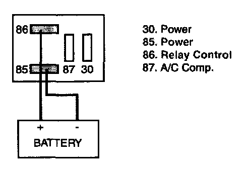 3. Apply 12 V and a ground to 85 and 86 terminals of the A/C comp. relay(Components side).