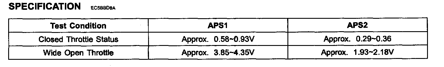 The Electronic Throttle Control(ETC) system is made of the components throttle body, Throttle Position Sensor(TPS) 1 & 2 and Accelerator Position Sensor(APS) 1 & 2. The APS is mounted in the accelerator pedal to detect the opening angle of the accelerator pedal. It has 2 sensors to detect the accelerator position and a malfunction of the accelerator position sensor. The ECM judges the current opening angle of the accelerator pedal from APS1 & 2, and the ECM controls the throttle motor based on these signals.