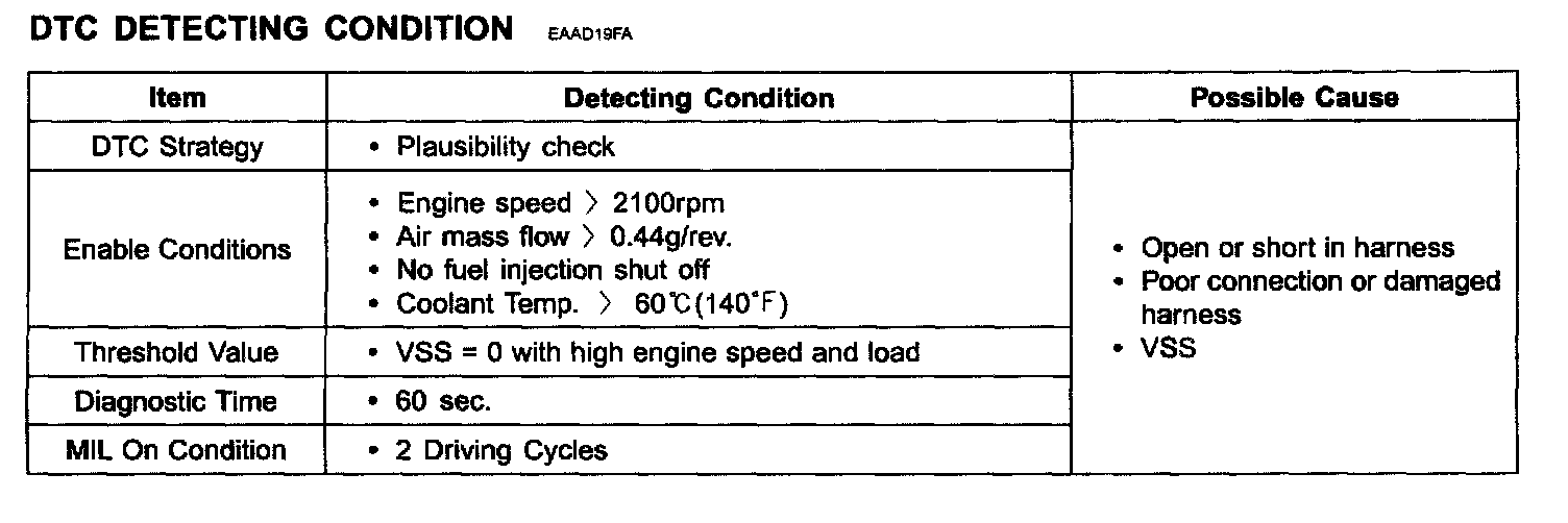 The ECM evaluates engine speed and mass air flow if there is no vehicle speed signal. This evaluation of both values will detect open circuit or short circuit errors on the wheel speed sensor. The ECM sets DTC P2159 if there is no vehicle speed signal from wheel speed sensor while both engine speed and mass air flow are higher than predetermined threshold during the predetermined time