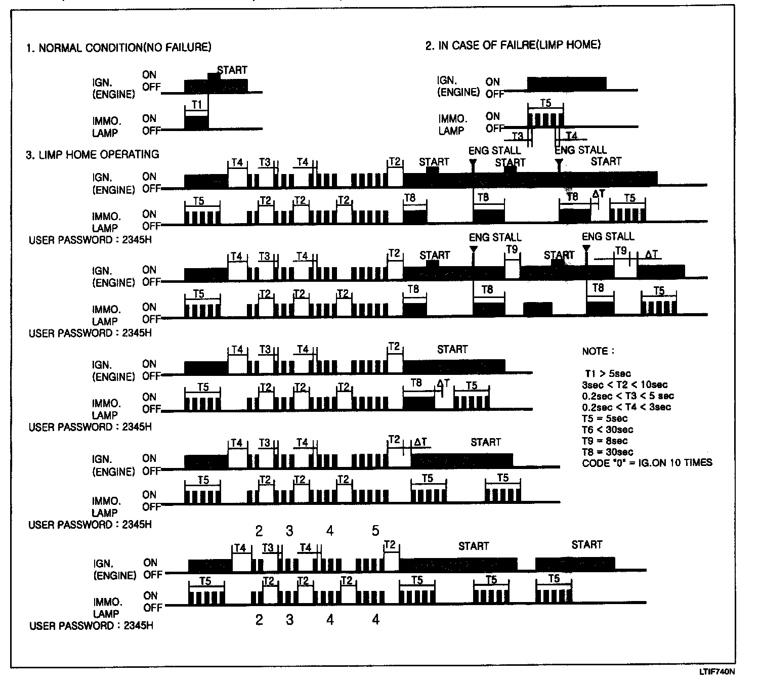 The limp home can be activated also by the ignition key. The user password can be input to the ECM by a special sequence of ignition on/off. Only if the ECM is in status "learnt" and the user password status is "learnt" and the user password is correct, the ECM will be unlocked for a period of time (30 sec.). The engine can be started during this time. After the time has elapsed, engine start is not possible. After a new password has been input, the timer (30 sec.) will start again.