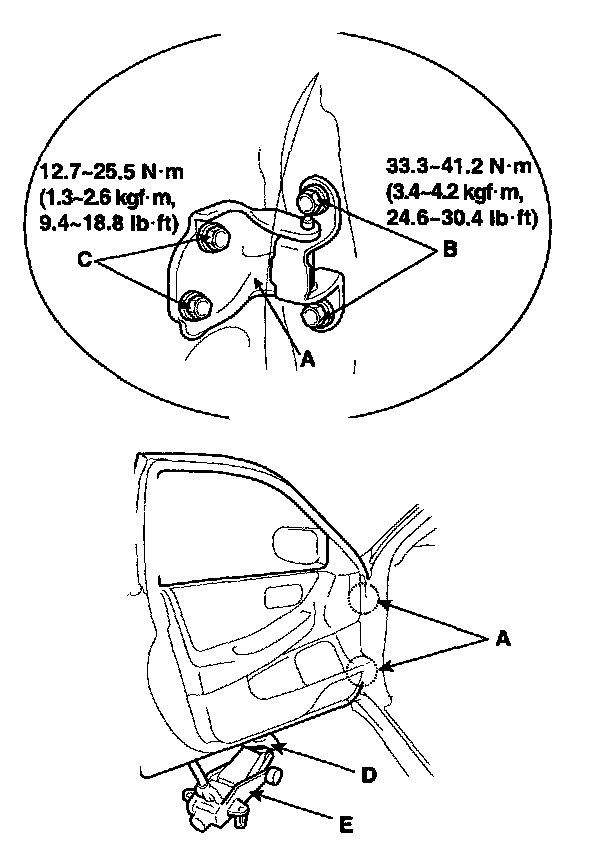 - Loosen the door mounting bolts (B) slightly, and move the door IN or OUT until it aligns flush with the body.