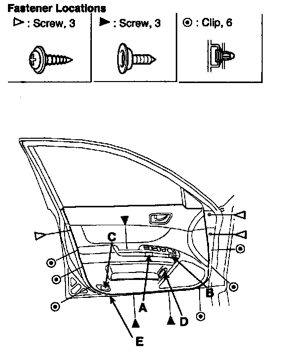 3. Loosen the door trim (E) mounting screws. Release the clips that hold the door trim, then remove the door trim by pulling it upward. Disconnect the power window switch connector(A), power mirror connector (B), and door courtesy lamp connector(C), trunk lid connector (D).