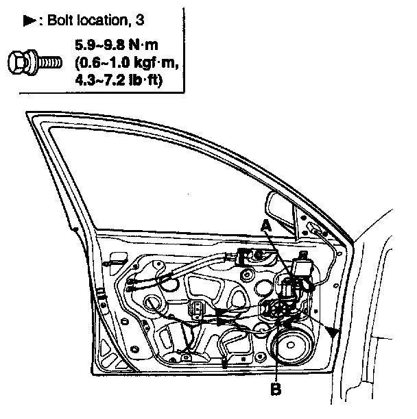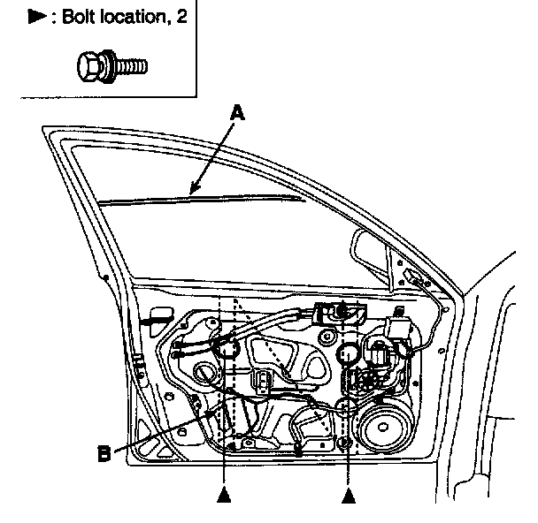 2. Carefully move the glass (A) until you can see the bolts, then loosen them. Separate the glass from the glass run and carefully pull the glass out through the window slot (B).