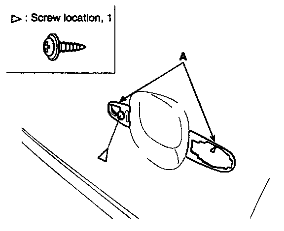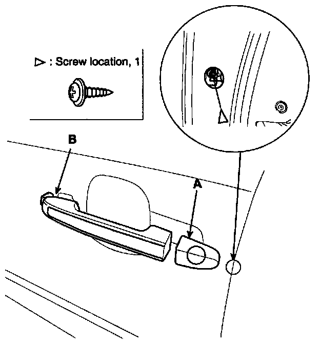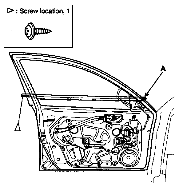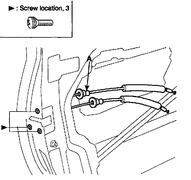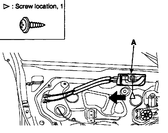 2. Loose the inside handle (A) mounting screw. Push the inside handle rearward to disconnect from the door module.