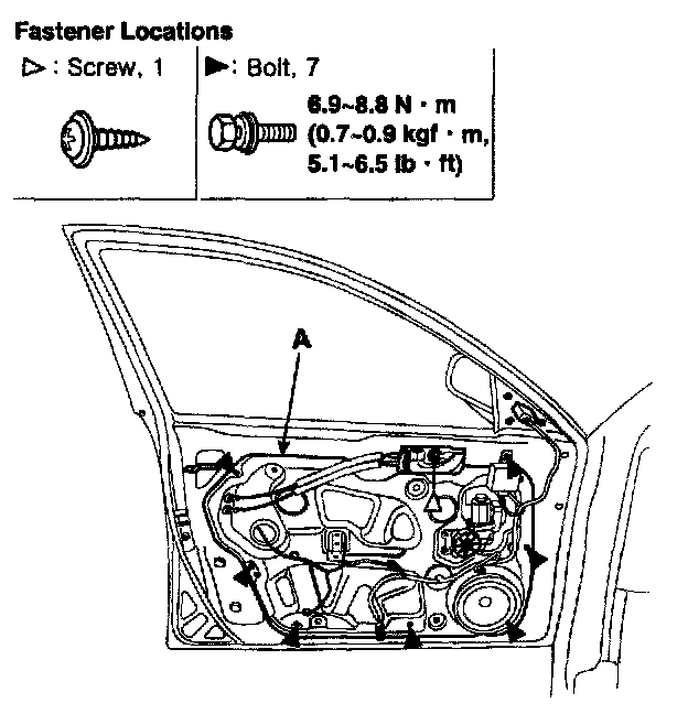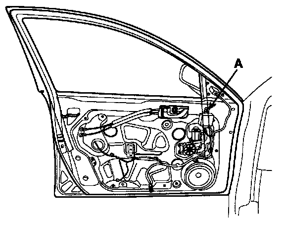 5. After loose the latch mounting bolts, remove the front door latch (A).