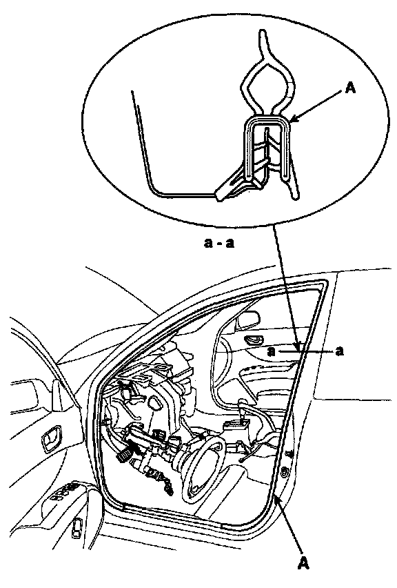 2. Release the hook (A), and then remove the door belt weatherstrip (B).