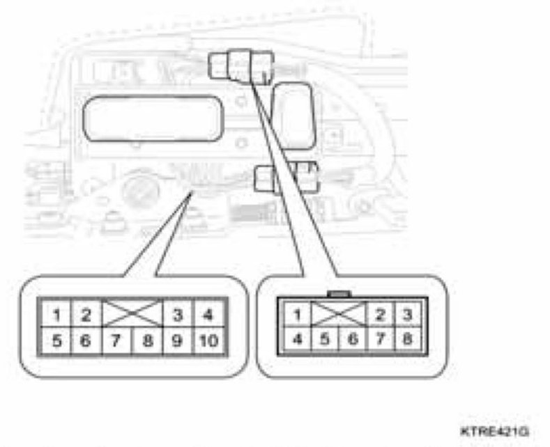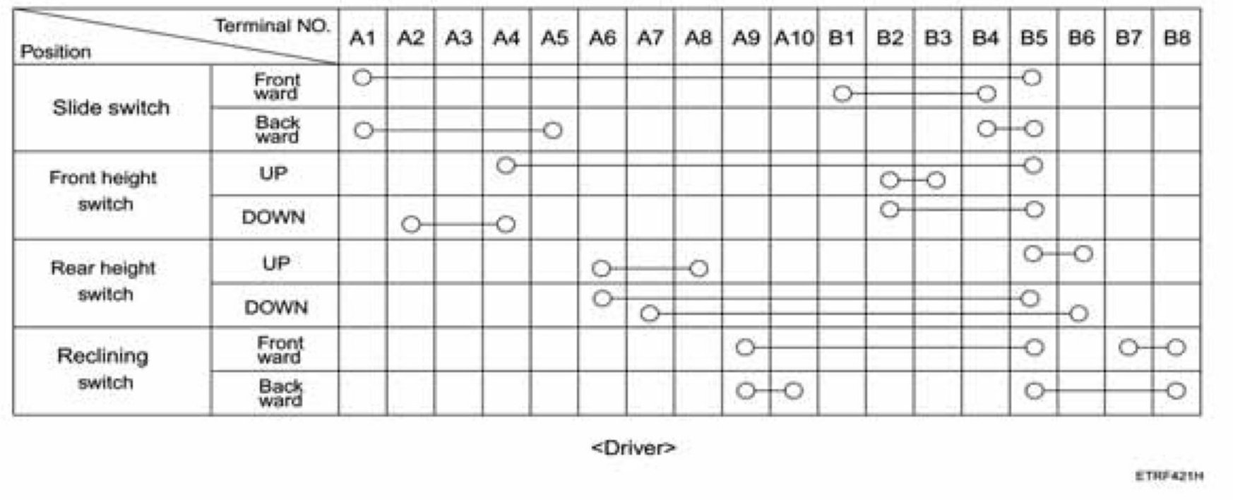 With the power seat switch in each position, make sure that continuity exists between the terminals below. If continuity is not as specified, replace the switch.