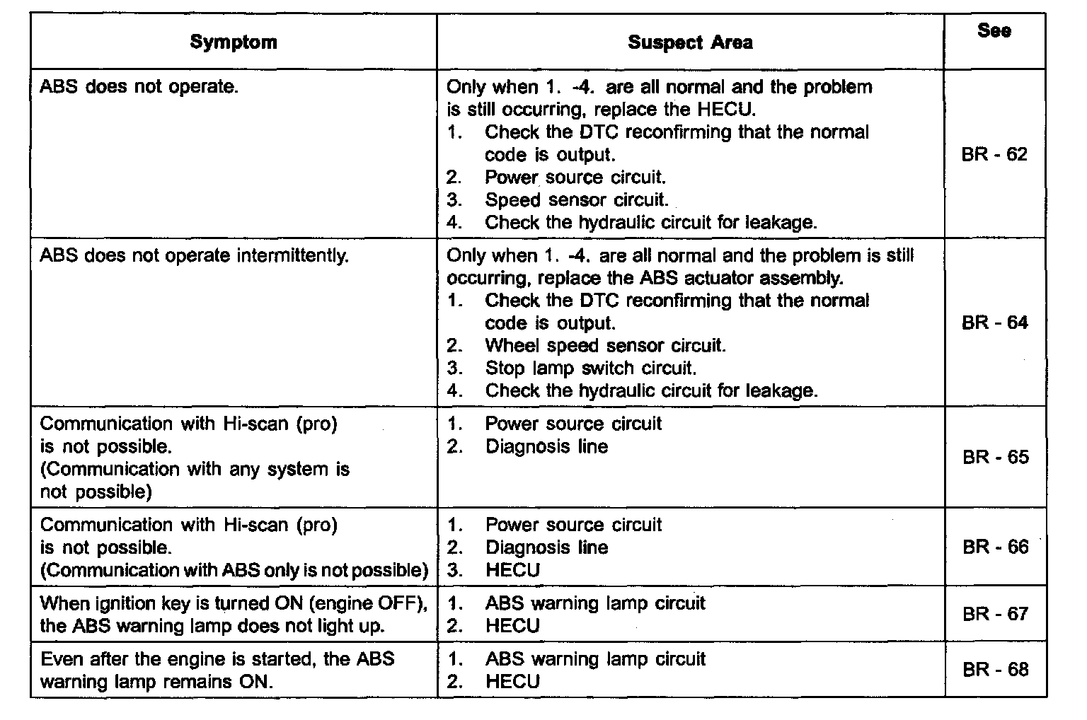 PROBLEM SYMPTOMS TABLEIf a normal code is displayed during the DTC check but the problem still occurs, check the circuits for each problem symptom in the order given in the table and proceed to the relevant troubleshooting.