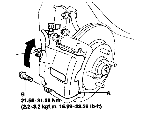 5. Pivot the caliper down into position. Being careful not to damage the pin boot, install the guide rod bolt (B) and torque it to proper specification.
