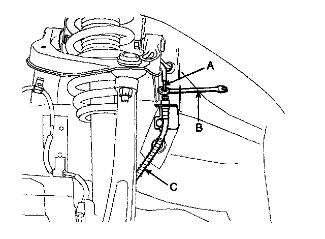 1. Disconnect the brake hose (c) from the brake line (A) using a flare-nut wrench (B).