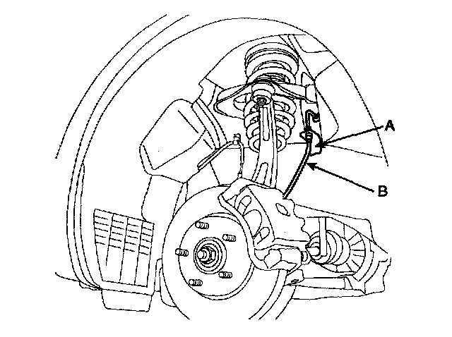 2. Remove the bracket mounting bolt (A), and then remove the brake hose (B).