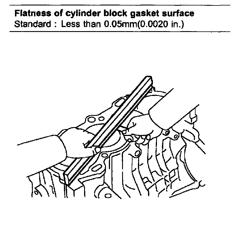 3. Inspect top surface of cylinder block for flatness. Using a precision straight edge and feeler gauge, measure the surface contacting the cylinder head gasket for warpage.