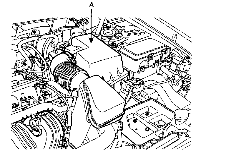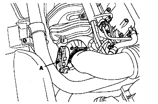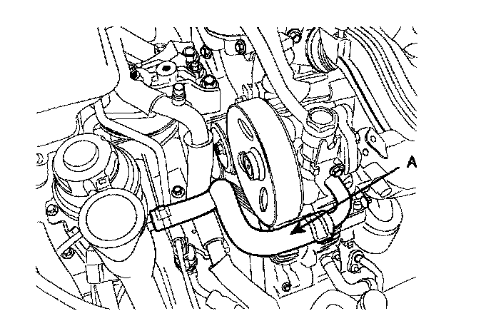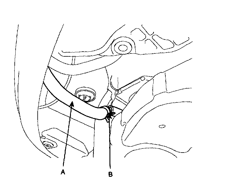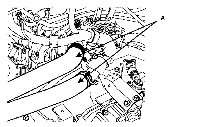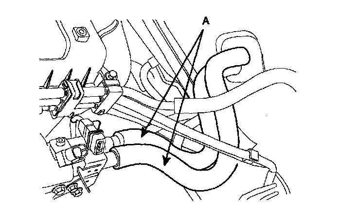 8. Remove the upper radiator hose and lower radiator hose (A).
