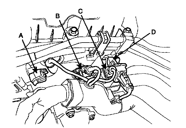 16. Disconnect PCSV connector (A), WTS connector (B), condenser connector (C), and CKP sensor connector (D).